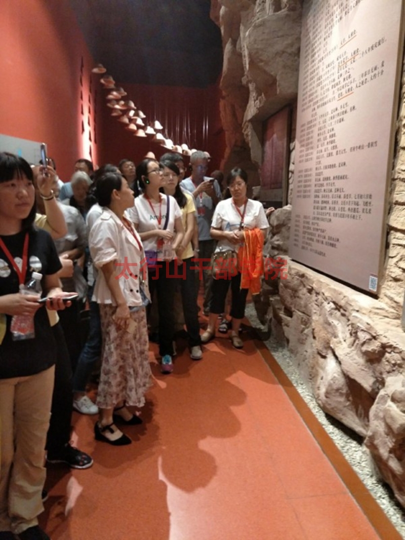 學(xué)員們?cè)诩t旗渠紀(jì)念館內(nèi)認(rèn)真聆聽(tīng)老師的講解
